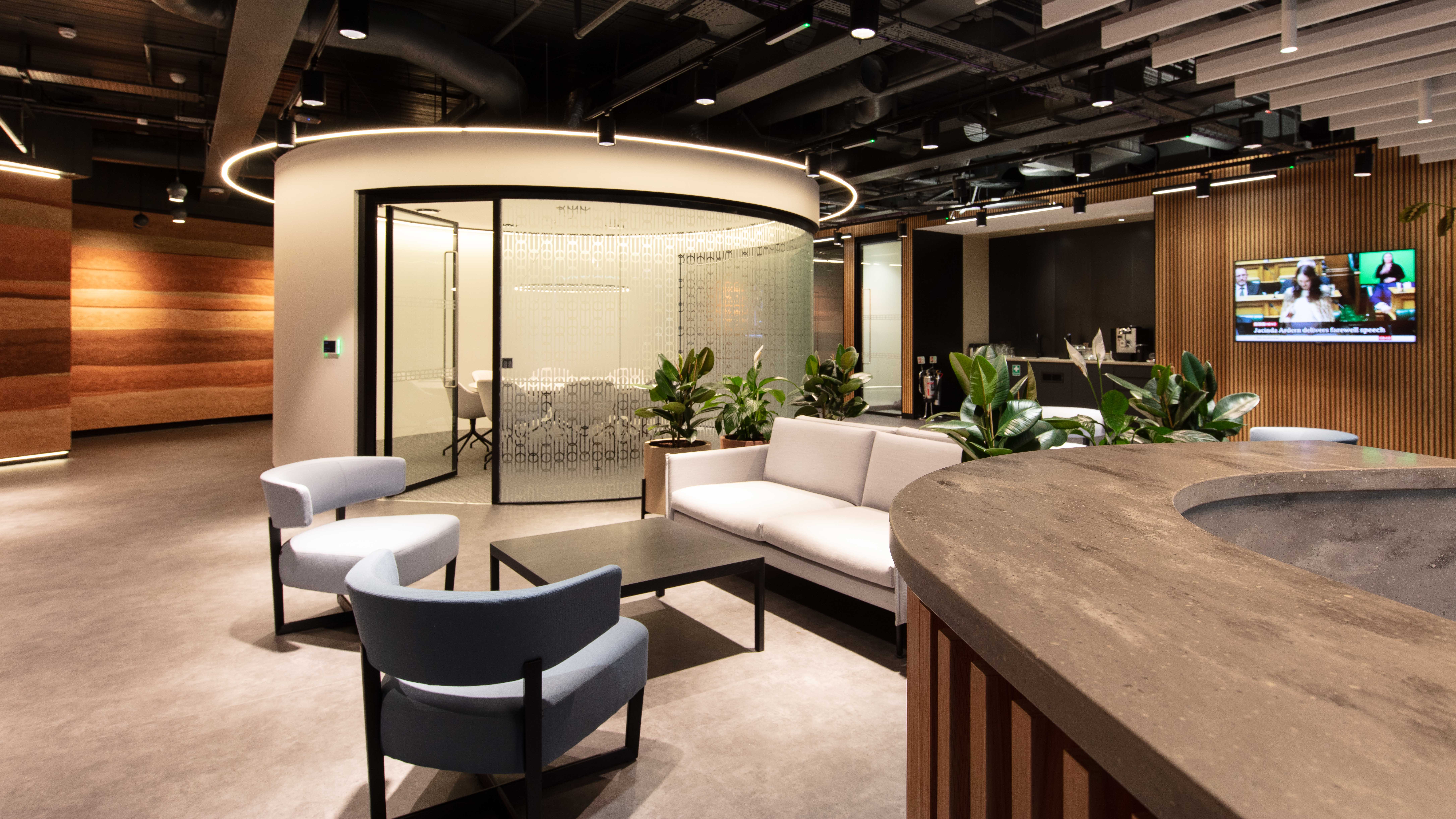 First impressions count, and a spacious entrance with curved wall panels, a curved reception desk and a circular stand-alone meeting room delivers the wow factor.