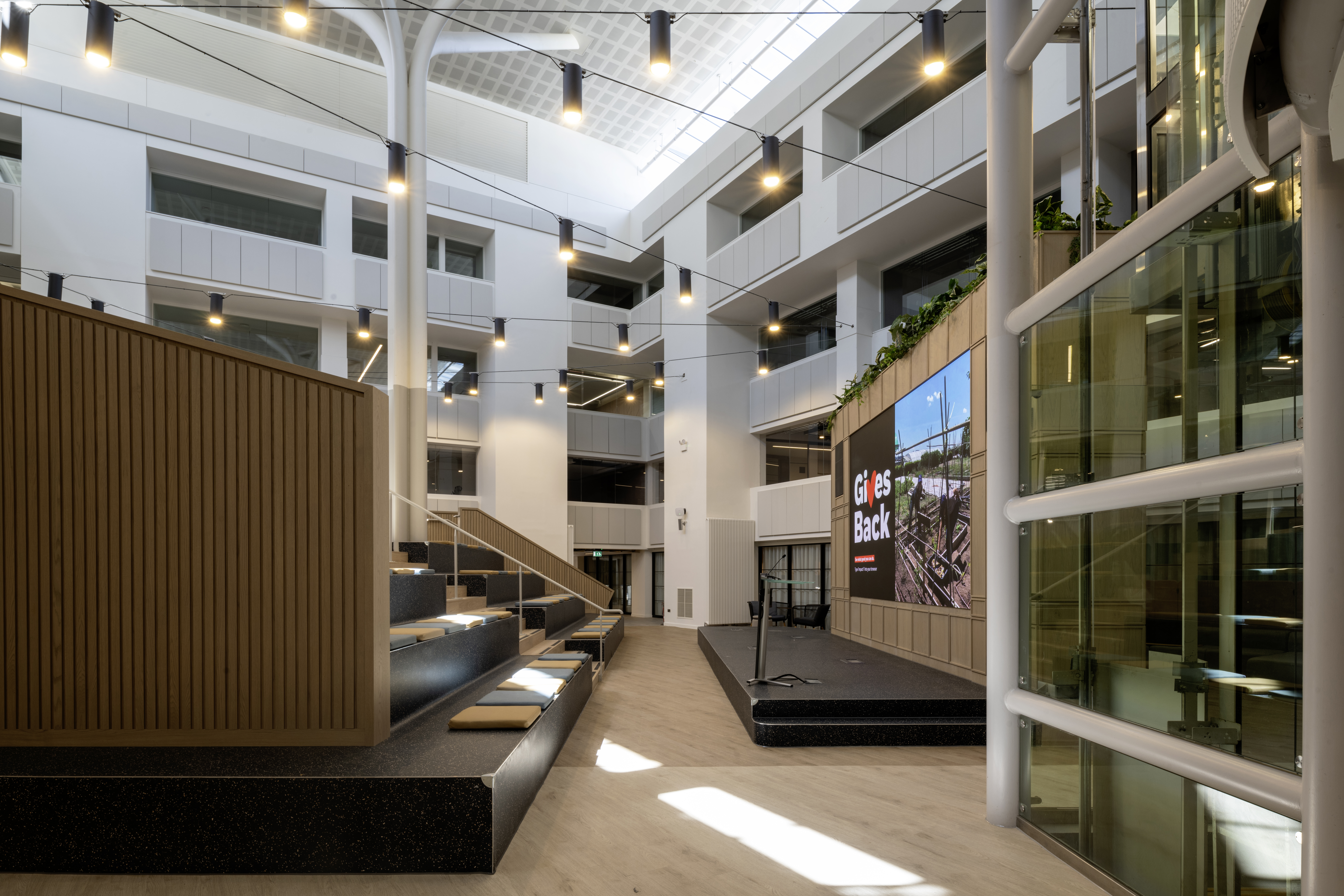 The building’s central atrium has been reimagined as a town hall space for company-wide meetings, events and presentations. Designed with flexibility in mind, the space includes integrated AV and can easily adapt to different group sizes and functions.
