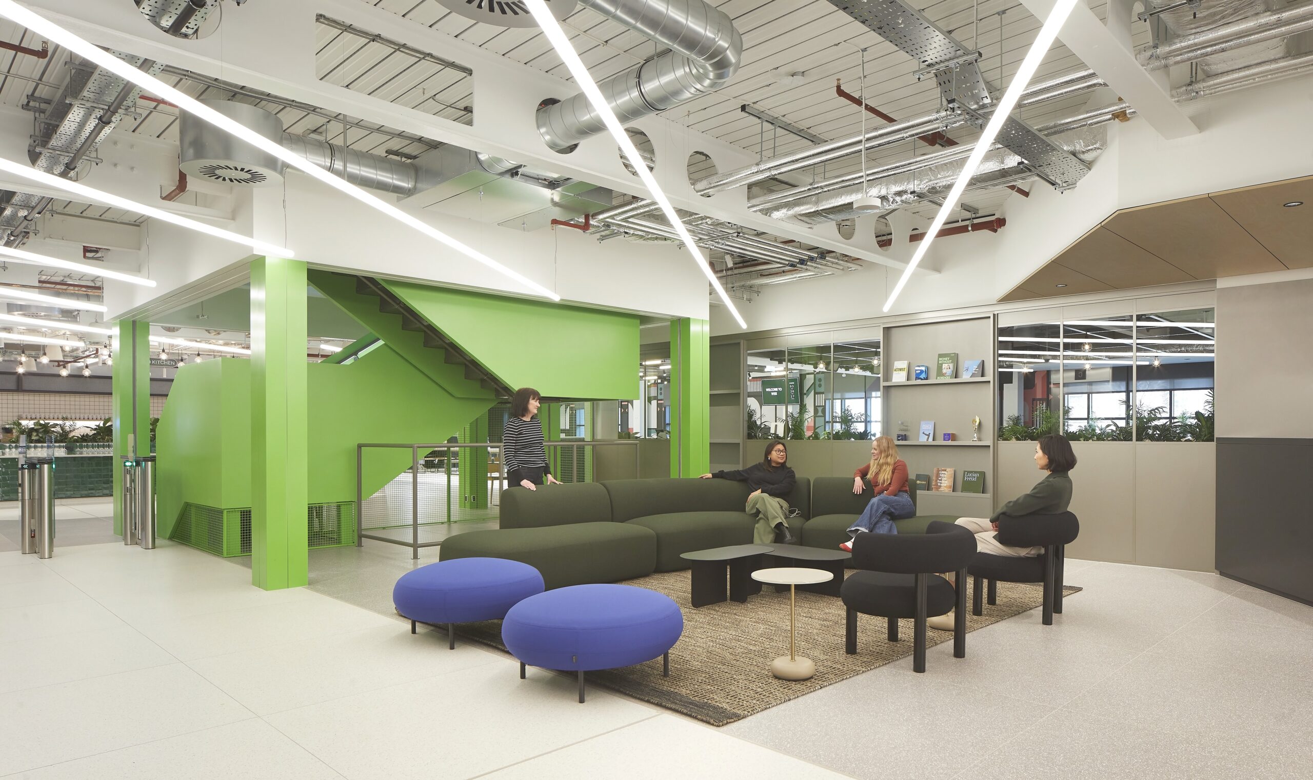 Wise occupies five of eight floors at Worship Square. Interiors reflect Shoreditch’s vibrant history with bold colours, expressive materials and curated artwork. Collaborative spaces include a central staircase, wellness amenities such as a sauna, nap pods and massage areas, as well as bespoke labs for research and innovation.